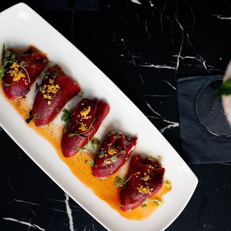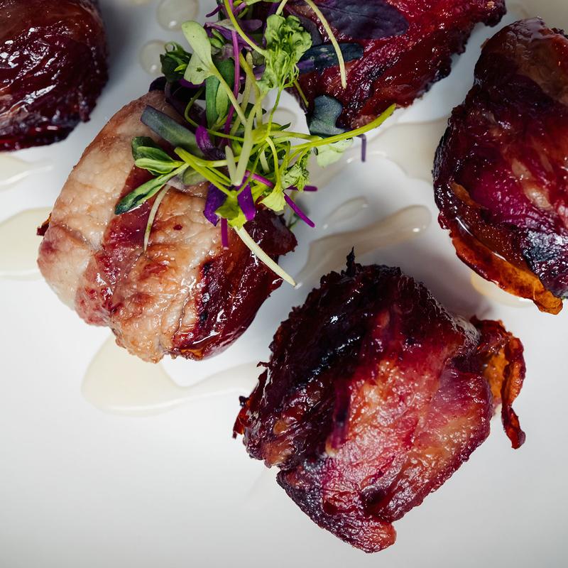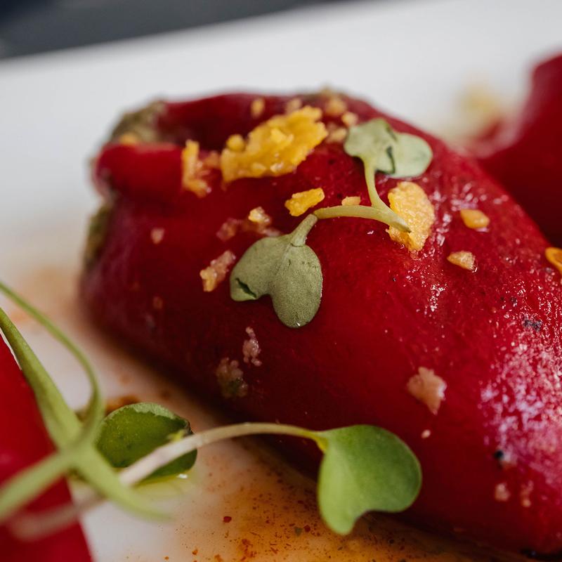 The food at this tapas place was so beautifully plated and it was delicious ! The ambiance inside is really pretty but since it was a nice evening we actually ate outside which was also very lovely .